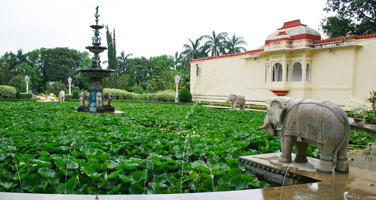 A pavilion of raining fountains was installed by Maharana Bhopal Singh to enhance the beauty of the garden. The concept behind the rain fountains was to create an imagery of maidens enjoying and dancing in the rain. These fountains were imported from England.